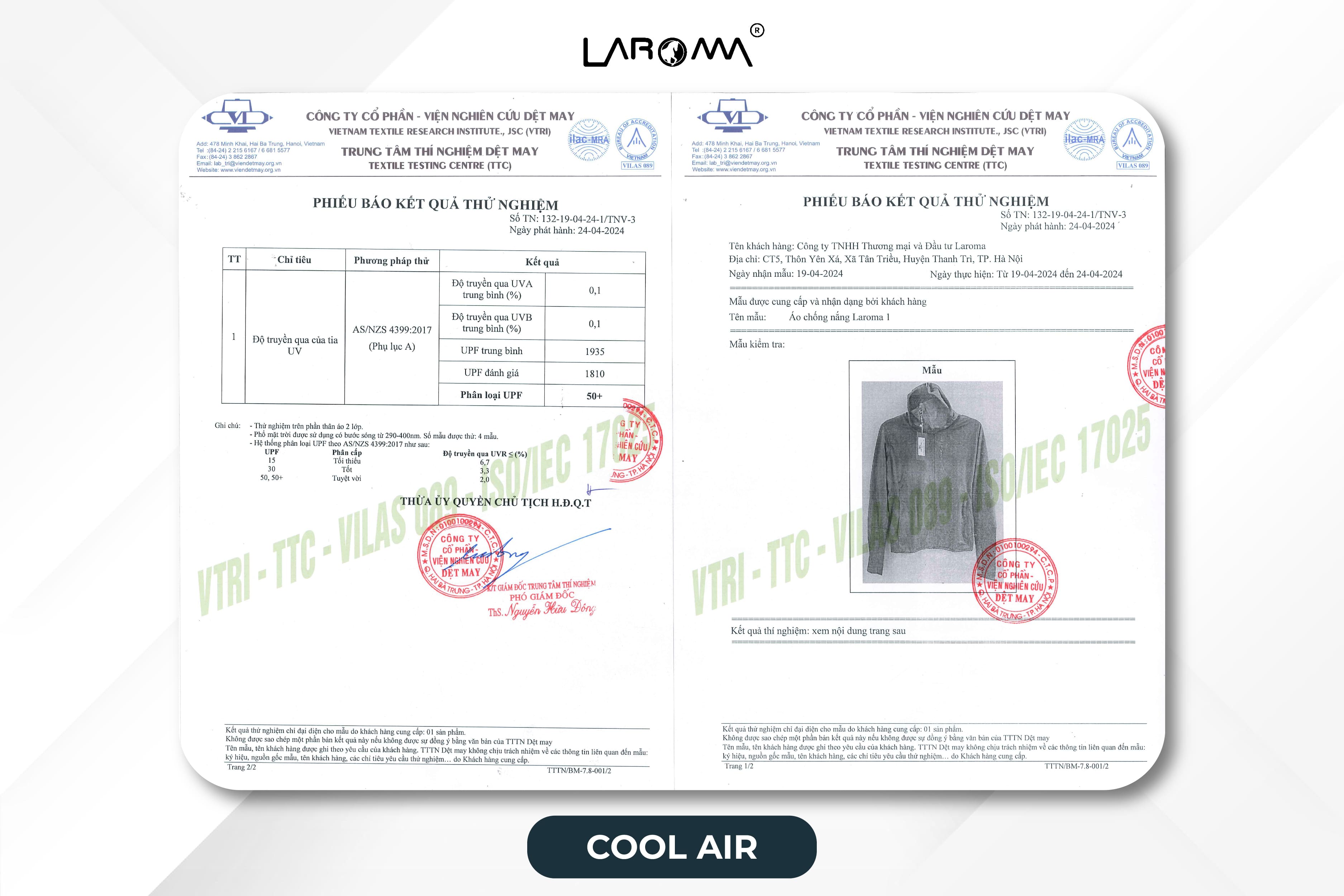 Giấy kiểm định áo chống nắng của Laroma đã được Viện Nghiên Cứu Dệt May Việt Nam đã kiểm định 2 lần và chứng nhận áo chống nắng Laroma đạt chuẩn UPF50+ theo giấy kiểm định số TN: 132-19-04-24-1/TNV-3 vào ngày 24/04/2024. Việc này khẳng định áo chống nắng Laroma là một trong những áo chống nắng tốt nhất hiện nay tại Việt Nam xét trên khía cạnh chống tia tử ngoại (UV).