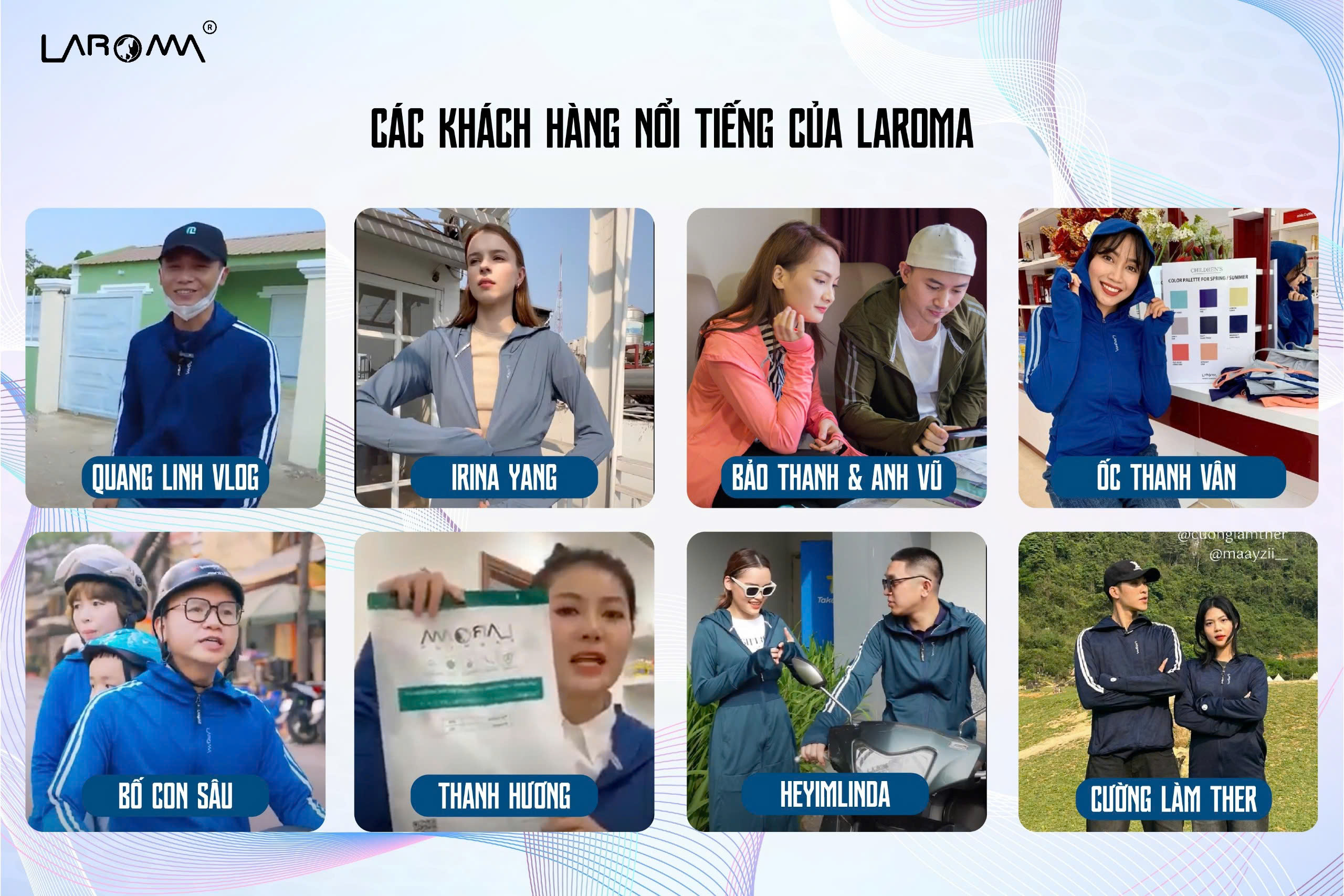 Khách hàng của Laroma: Với hàng triệu sản phẩm đã bán trong và ngoài nước, dưới đây là một số khách hàng nổi tiếng đã tin dùng áo chống nắng Laroma: Diễn viên Thanh Hương, Gia đình Ốc Thanh Vân, Diễn viên Bảo Thanh Và Anh Tú “Về nhà đi con”, Người mẫu Andrea, Hot couple Linda Ngo & Đạt, Người mẫu Irina Yang, Gia đình Ba Con Sâu, Quang Linh Vlog,...
