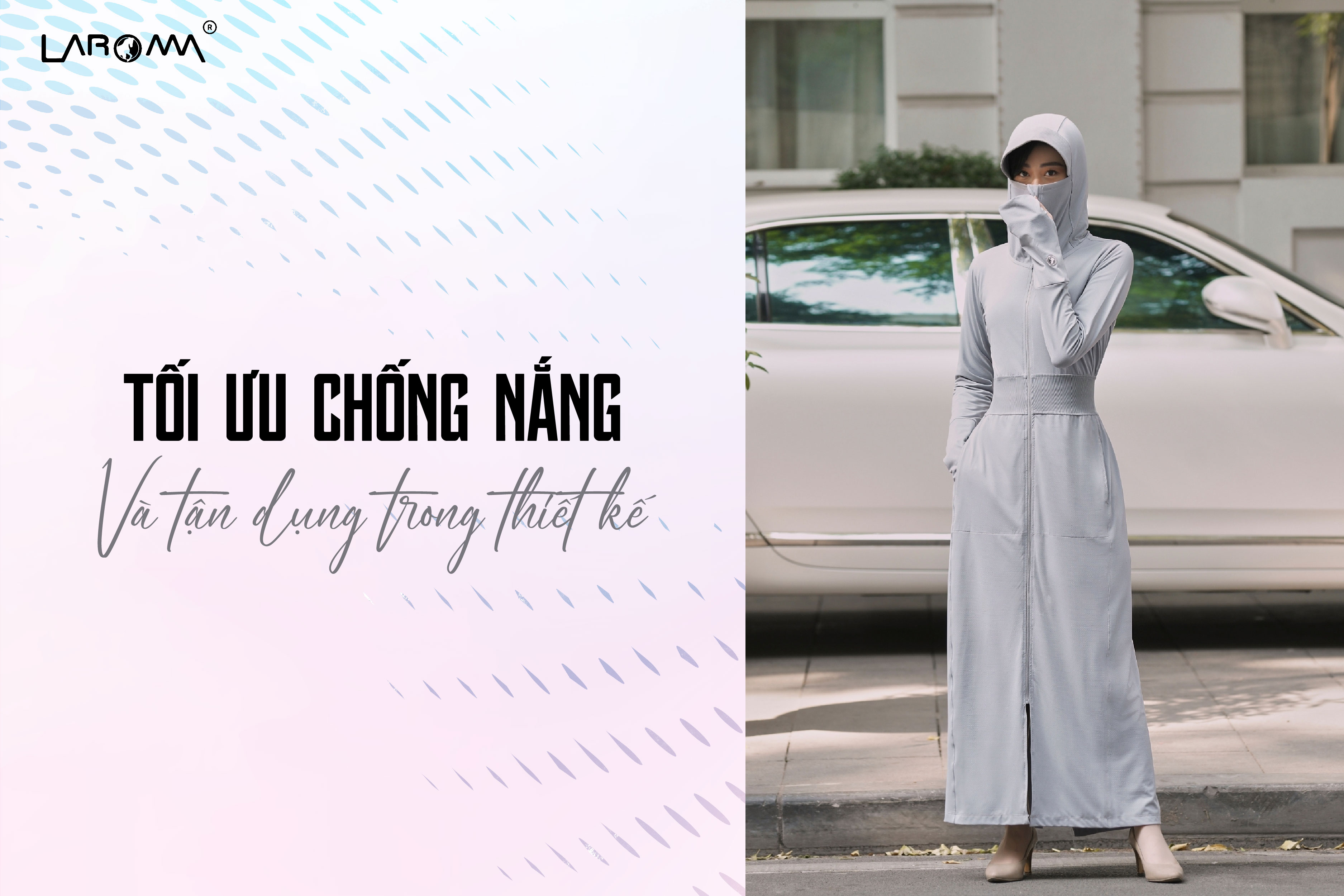 Áo choàng chống nắng Laroma được thiết kế tối ưu cho khả năng che chắn. Phần mũ áo với vành lưỡi trai rộng che kín phần đầu và trán. Cổ áo kéo cao có thể được sử dụng thay thế cho khẩu trang. Tay áo thì được thiết kế xỏ ngón kéo dài che kín toàn bộ ngón tay, hỗ trợ bảo vệ bàn tay của chị em mà vẫn không gây hạn chế vận động, cầm nắm. Khóa tàng hình YYK được giấu kín, góp phần tăng thêm tính thời trang cho sản phẩm. Ngoài ra, chỉ một chiếc áo chống nắng nhưng lại có thể chứa rất nhiều vật dụng cá nhân với hai túi ngoài có khóa kéo chắc chắn, hai túi trong rộng rãi với kích thước đựng vừa một chiếc máy tính bảng 8 inches.