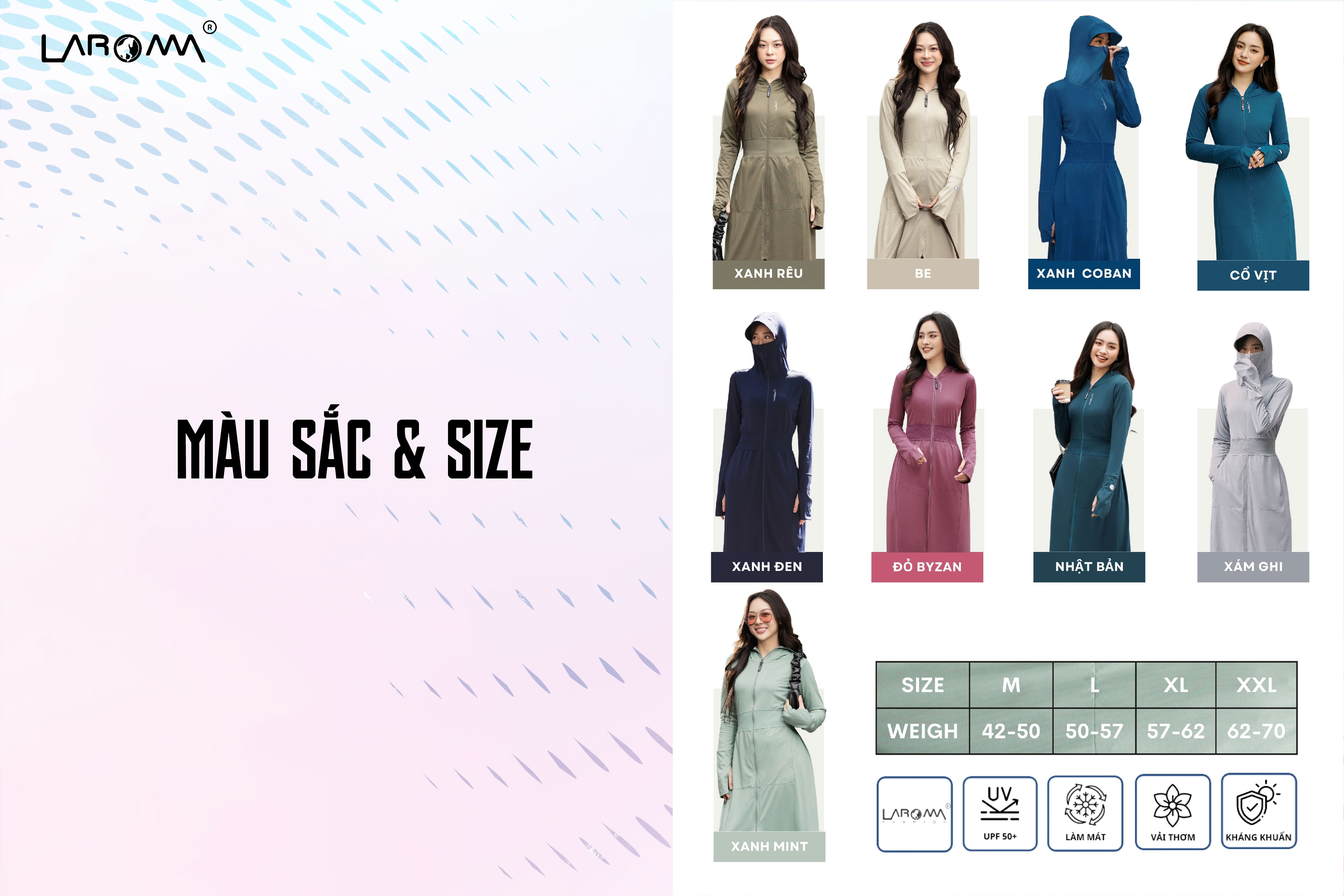 Áo chống nắng Laroma có 9 gam màu thời trang dễ phối đồ: Xanh rêu – Be – Xanh coban – Cổ vịt – Xanh đen – Đỏ Byzan – Nhật Bản – Xám ghi – Xanh mint.